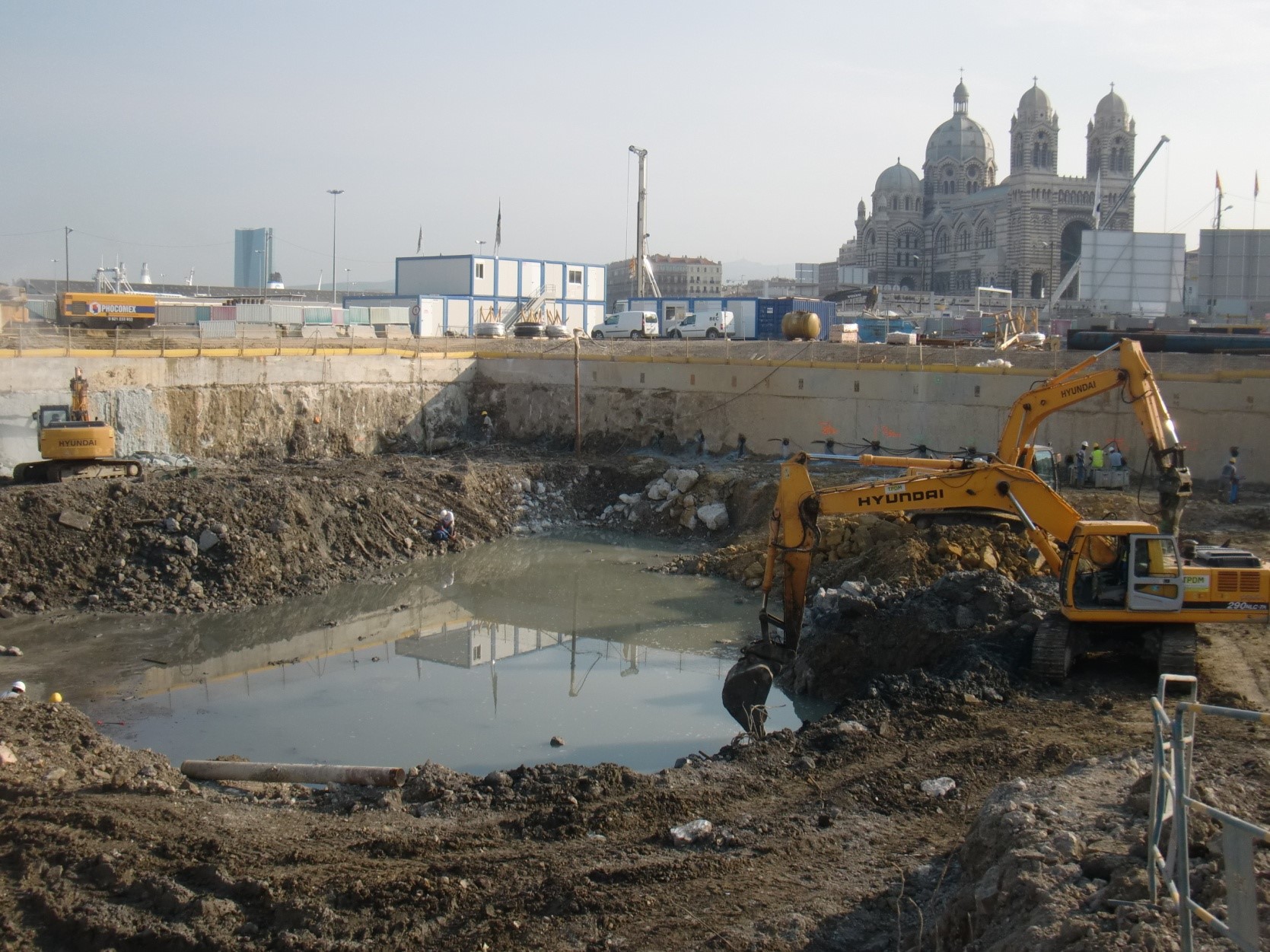 La fouille a été creusée à travers les remblais et alluvions de surface à l’abri d’une paroi moulée tirantée, encastrée dans les marnes et conglomérats du stampien.